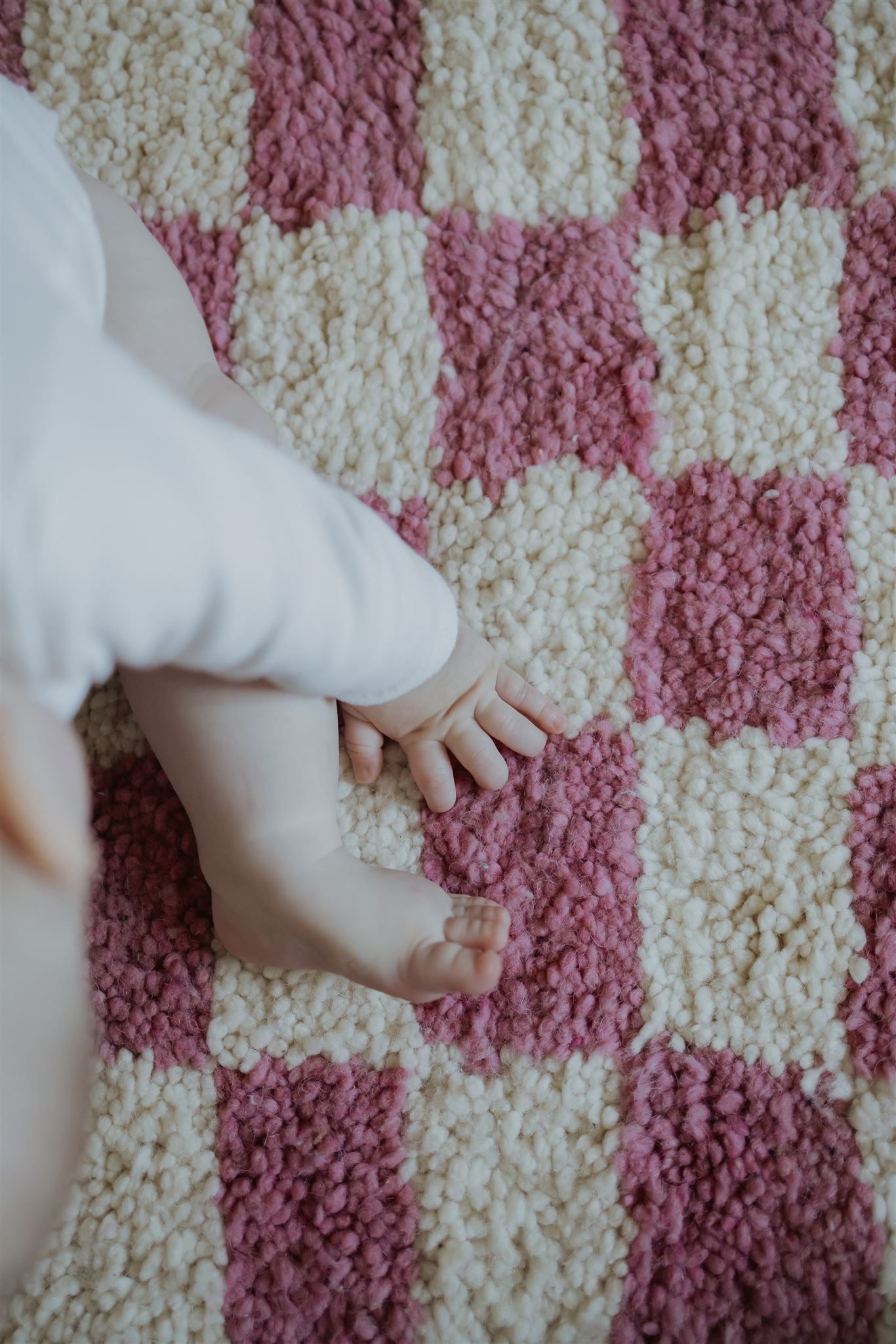Magnifique tapis Béni Ouarain rose et blanc à damiers n°57. Ce tapis possède une frange sur le côté.